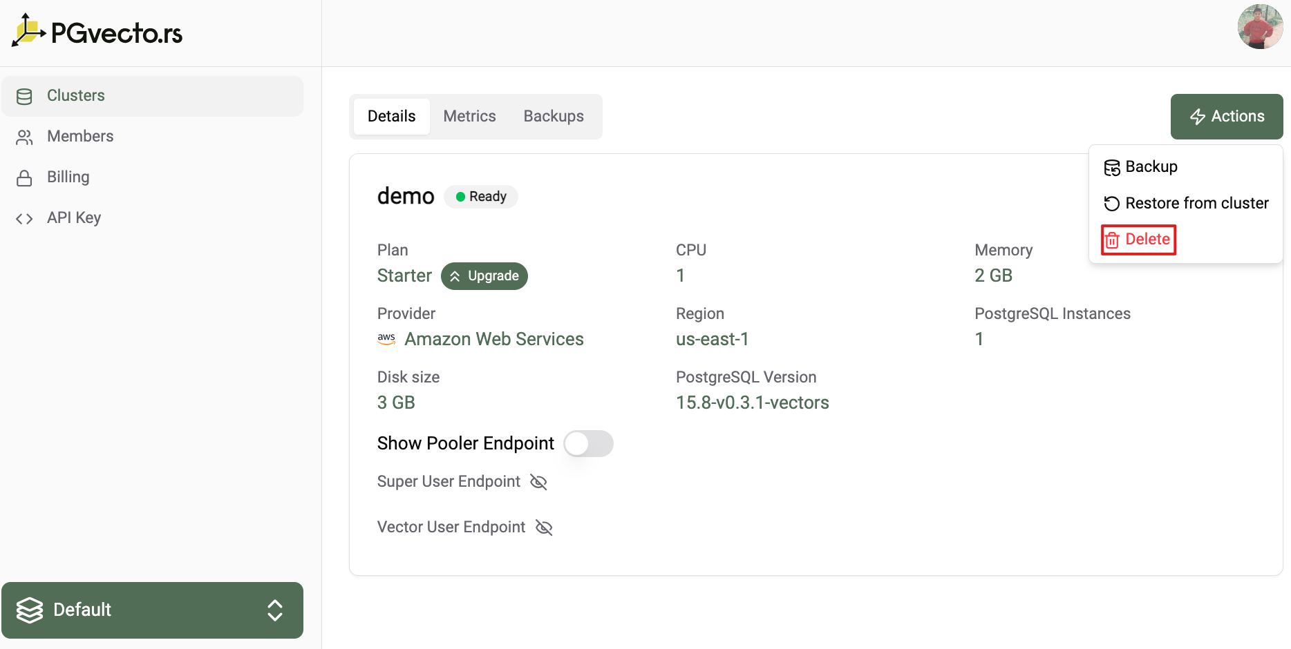 If you want to delete a cluster, navigate to the VectorChord Cloud Console and click on the "Delete" button.